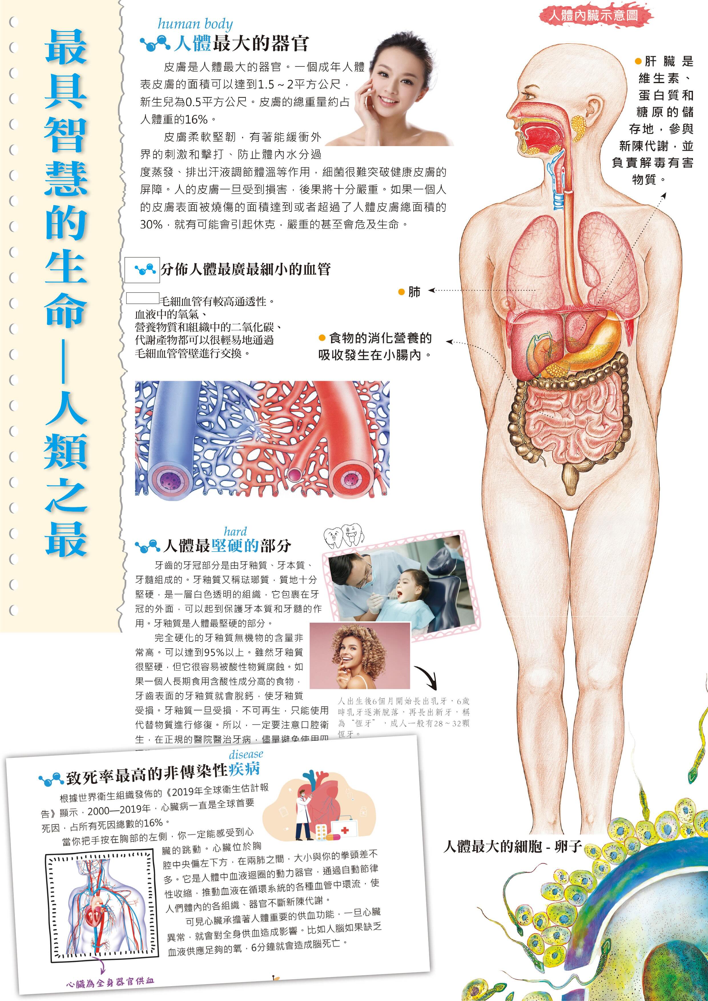 - 人體:最大器官皮膚、最堅硬部位牙釉質、心臟功能