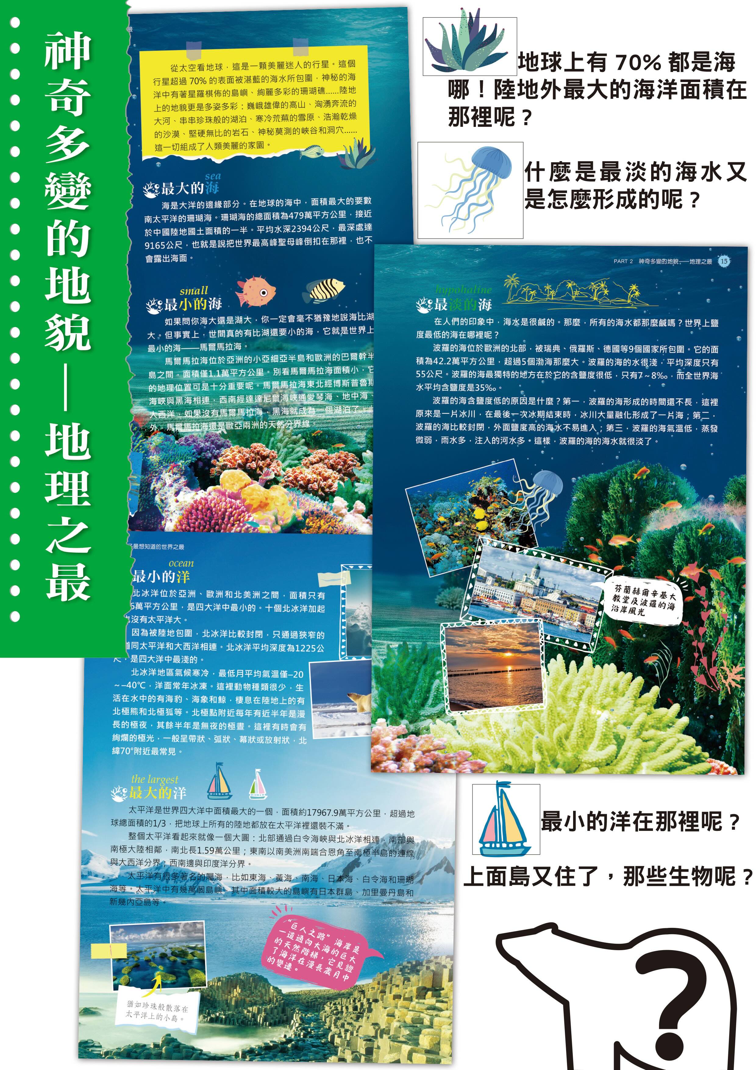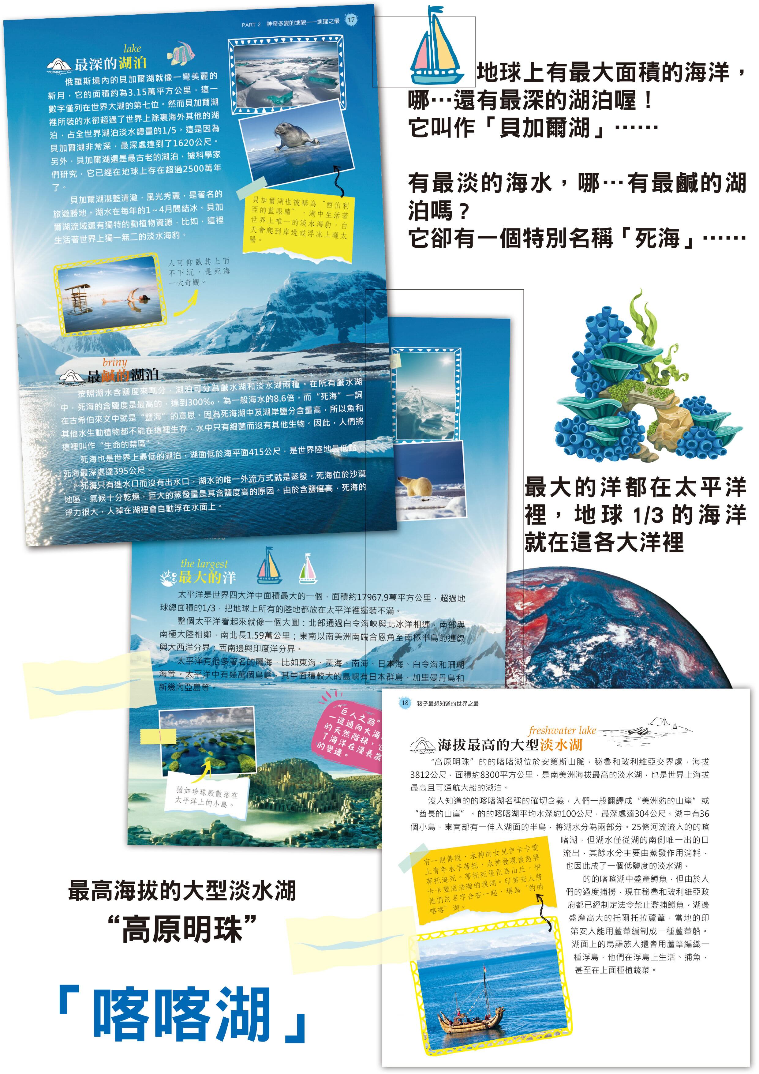 - 地理:最大洋太平洋、最小海、最淡的海水、貝加爾湖、的的喀喀湖