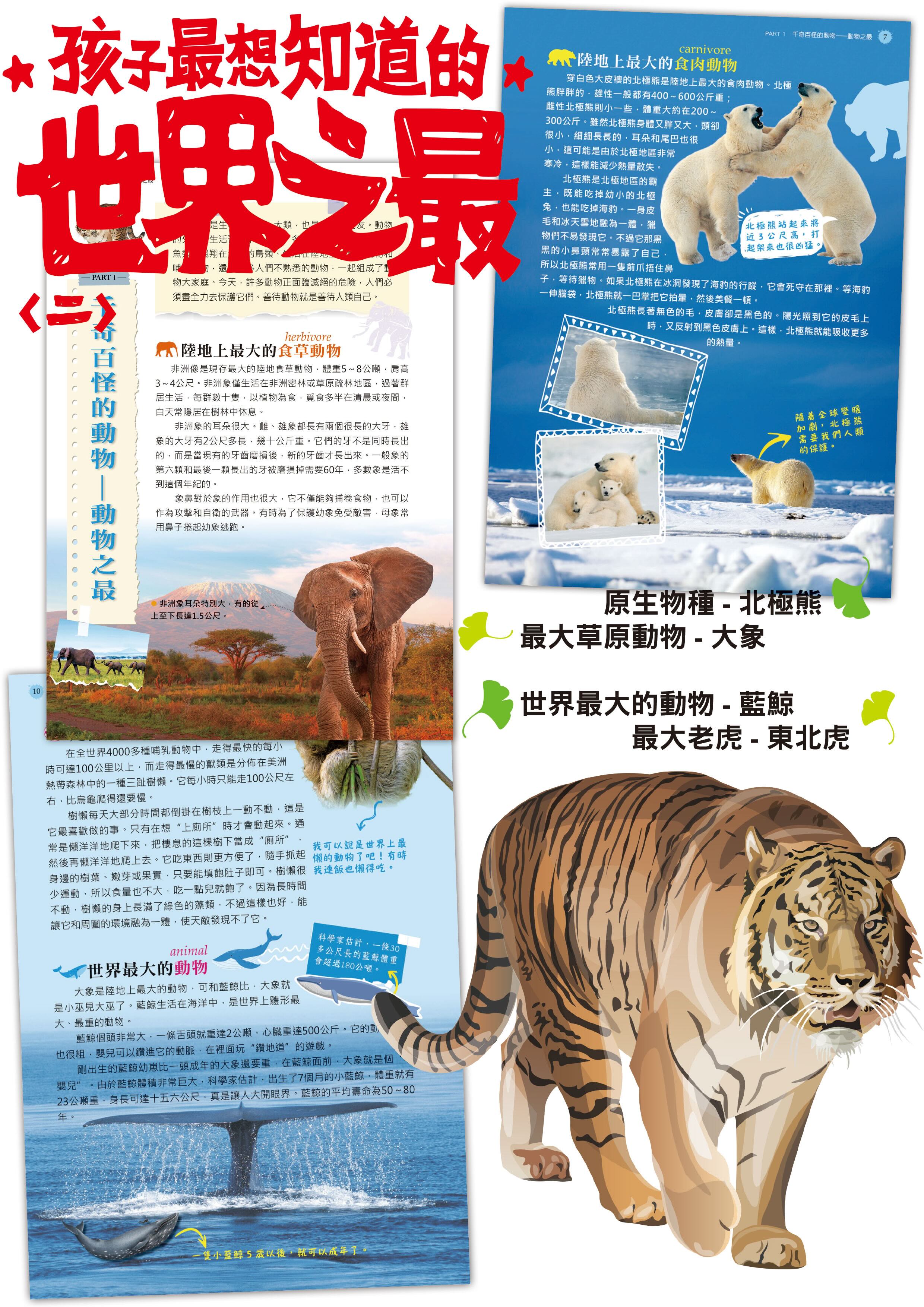 - 動物:陸上最大食肉北極熊、最大動物藍鯨、最慢的三趾樹懶