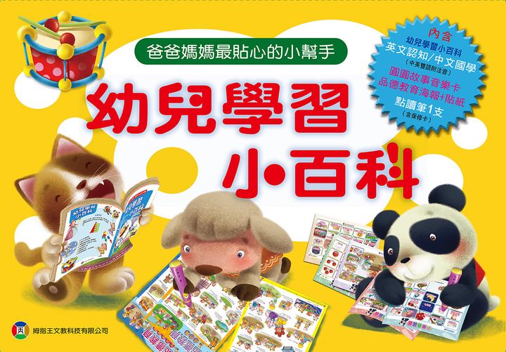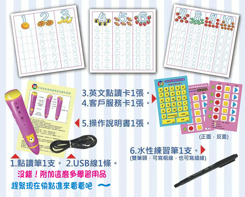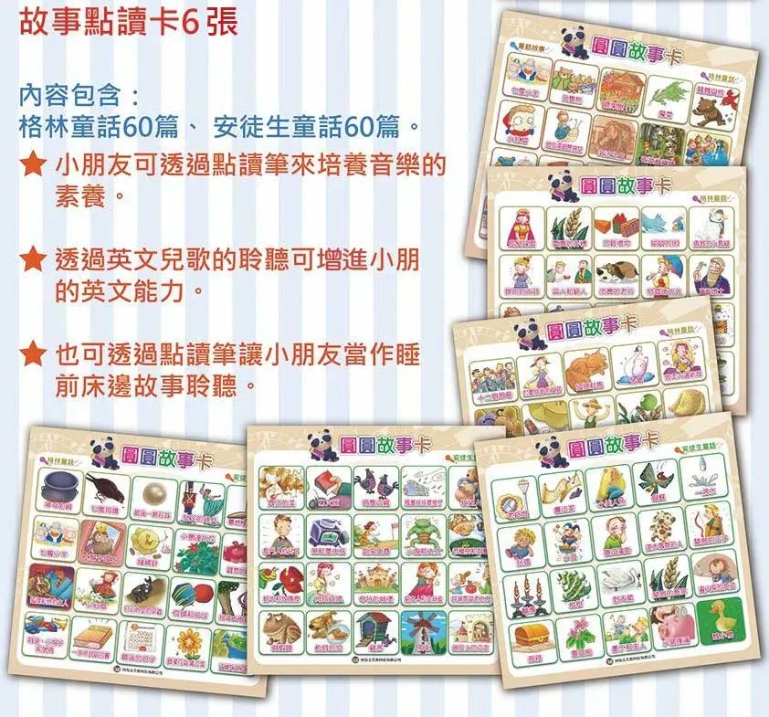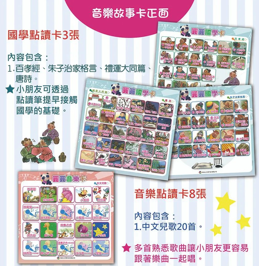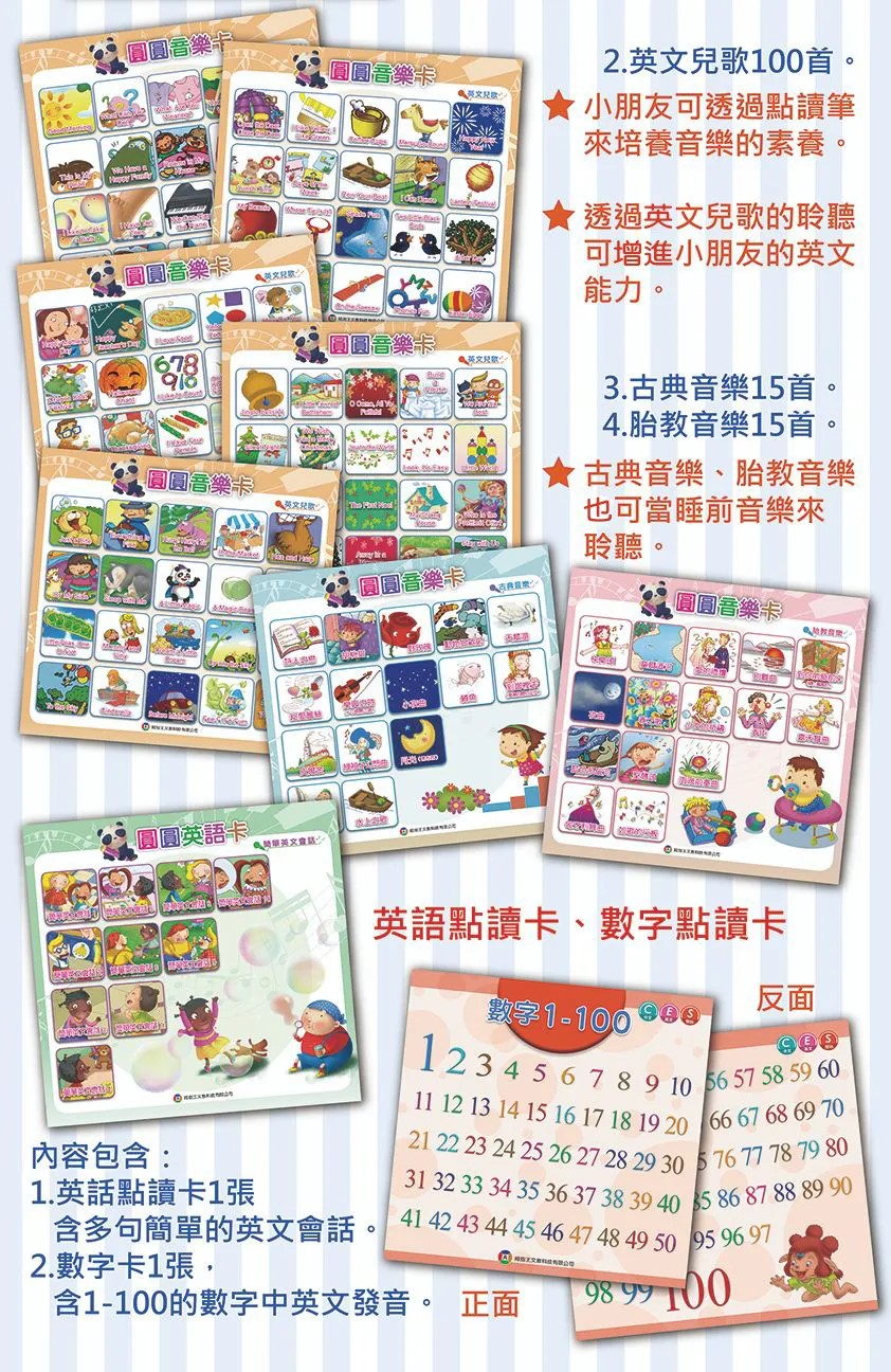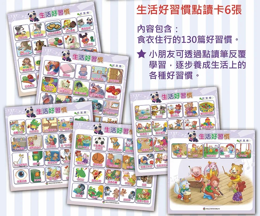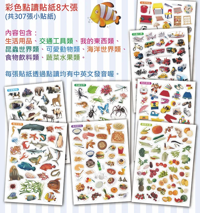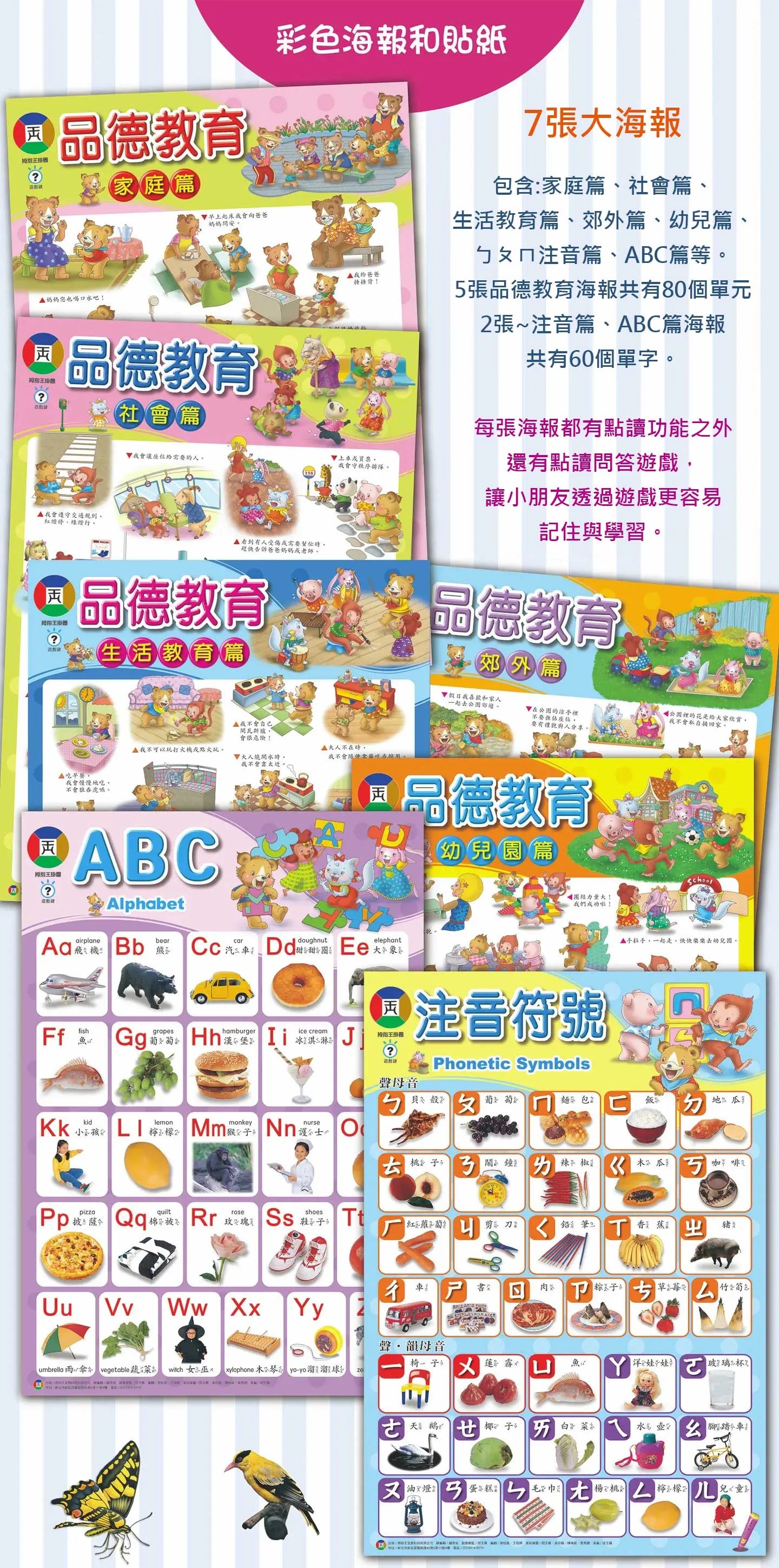 含 1 支充電式光學點讀筆、2 本彩色精裝點讀書(每本 80 頁)、307 張中英文貼紙、5 張品德教育大海報、8 張遊戲貼紙,以及多種學習卡與音樂卡,內容豐富多元。