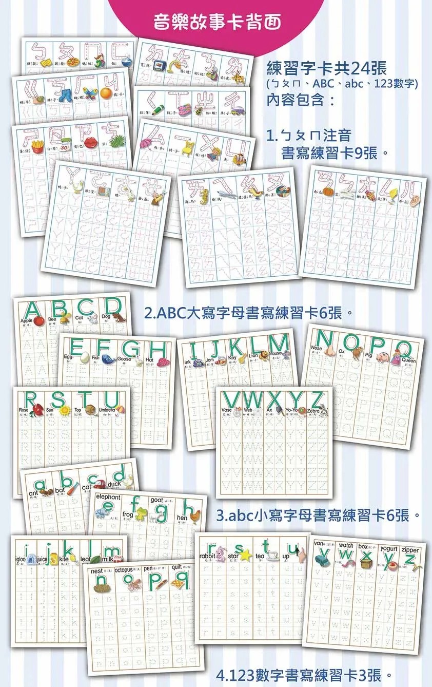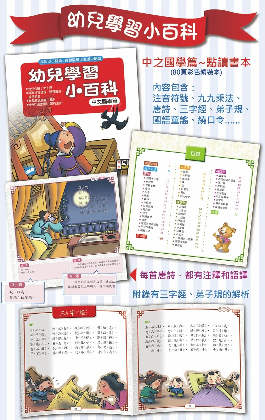 涵蓋歌曲、古典樂曲、故事、詩詞、英文、注音等,內容跨領域,學習更有趣。