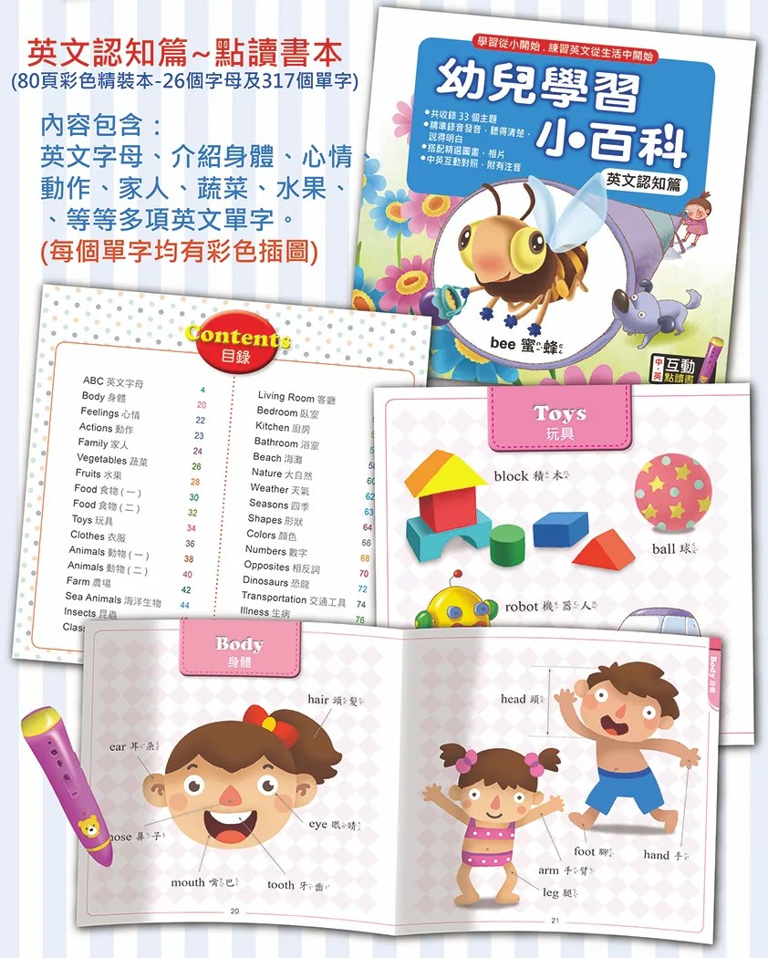 附英文單字字典卡與錄音卡,孩子可查單字、跟讀、錄音,矯正發音,邊玩邊建立中英文語感。
